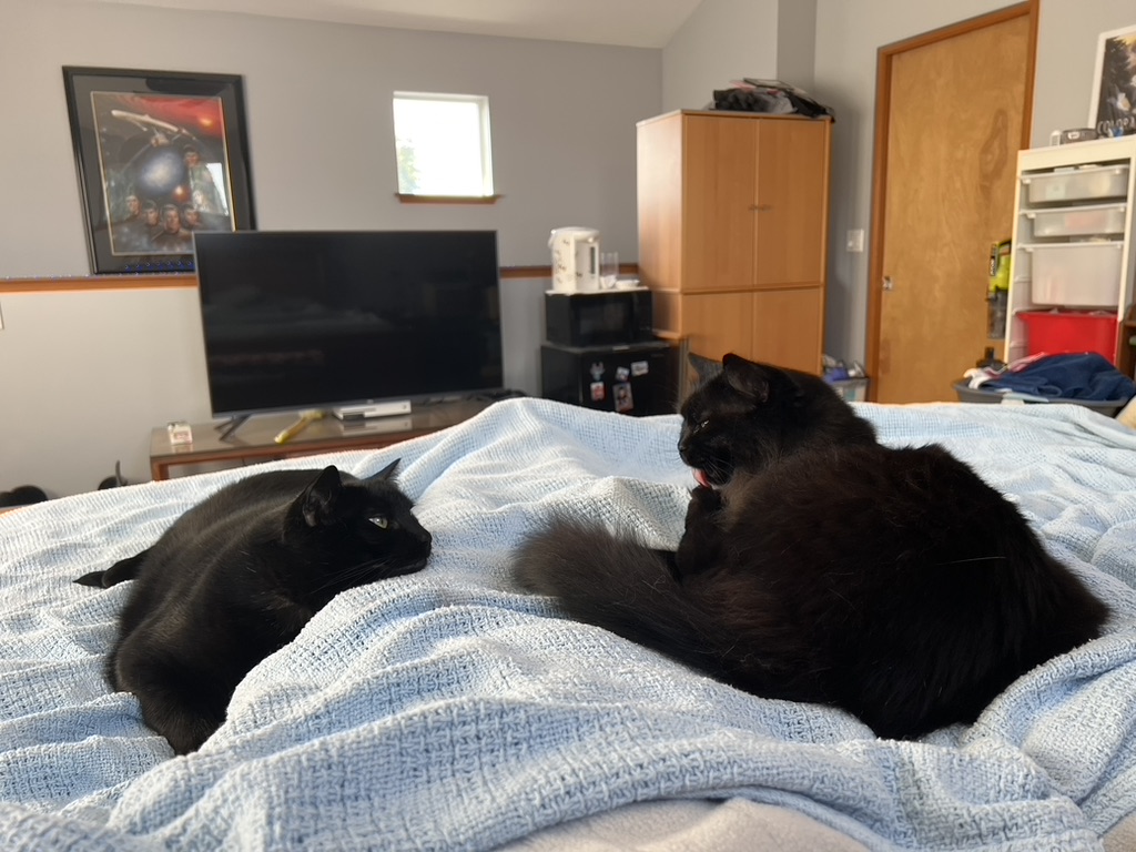 We met quite a few neighbors in April through the NextDoor app. Y’all know I adopted Cora last year. Well, in April this year, Cora ran away after a not-quite-closed-door blew open by wind. A neighbor trapped a black cat, but it was not Cora. Devastated, I adopted Sheba on May 1, then other neighbors helped find Cora a day or two later. Cora had been missing for three weeks. We had to slowly introduce both cats to each other and they seem to be getting along, but they are not friends.