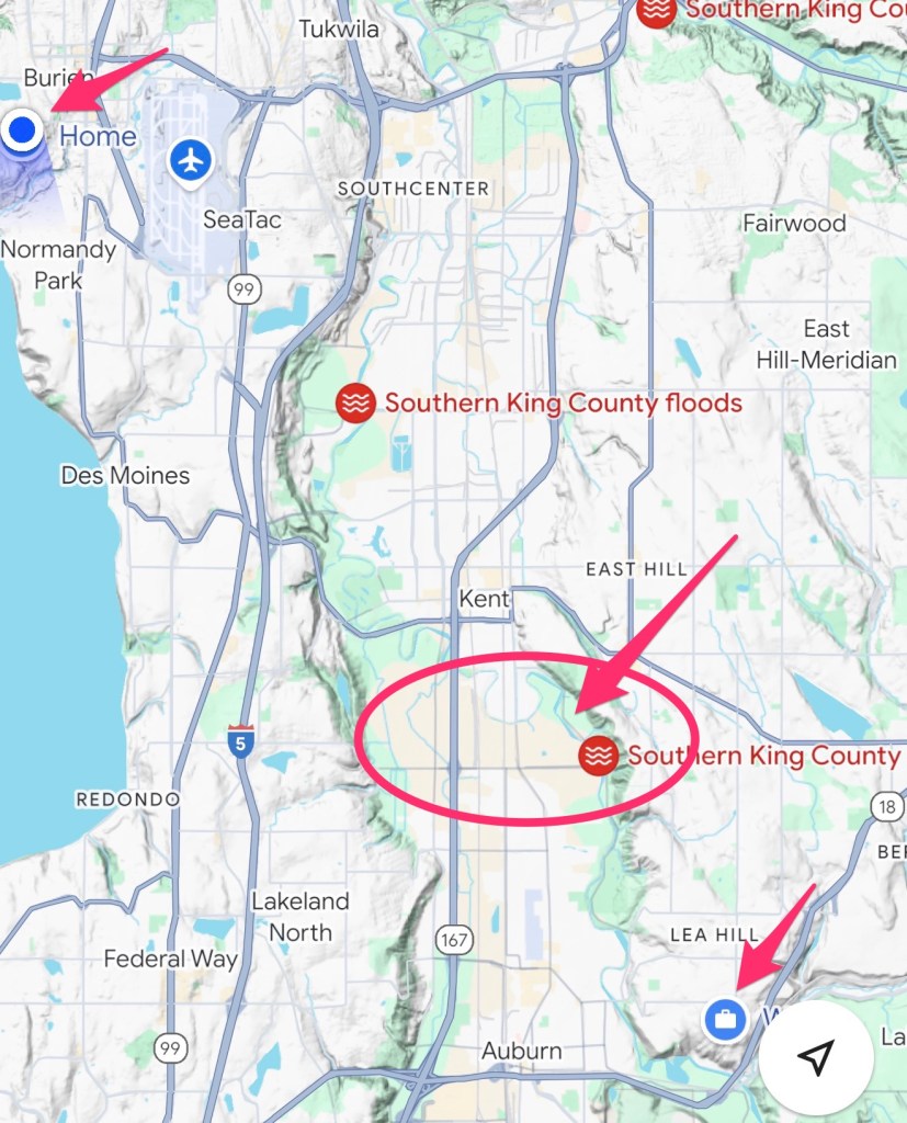 Here is a map of the region I live. I live on a hill in Burien, and my work is also on a hill in Auburn. In between is a valley where the Green River meanders. The circled area is where there was flooding. There was another flood just south of Auburn caused by the White River. The flooding by the Green River caused a shutdown of SR167, a major north-south highway that we use to drive to work. Luckily, we didn’t have to go to work as our college decided to close the college for two days.